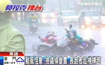 报道称,南台湾的风大到骑摩托车都骑不动,摩托车一台接着一台倒。一位大姐强风中还载着至少2米长的铁条,原来是贪便宜捡铁条变卖,就算阻挡了车道甚至刮伤路边汽车她也不在乎。不过最神勇的,还是一名长跑的老兄,不知道是不是看到风吹人跑得快,这名长跑者偏偏选在台风天锻炼身体。(罗煜明)
