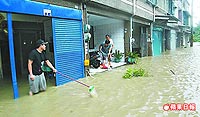 高雄县梓官乡淹水,市场摊贩仍硬着头皮摆摊,表情无奈。来源:台湾《苹果日报》