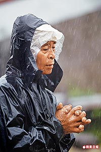 而台东太麻里溪溃堤,更造成金峰乡、太麻里乡多个村落遭山洪吞噬,至少千人无家可归。一名金峰乡嘉兰部落耆老独自站在已成滚滚洪流的太麻里溪旁,仰视灰暗苍天,向祖灵祈求平安,期盼“天地能安静下来”。
