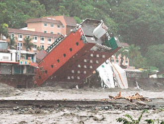 昨天中午11时38分,有22年历史的金帅饭店,不敌激浊的山洪,在对岸围观群众惊叫声中,瞬间倒入知本溪中,附近十栋民宅与商店也被冲走;海岸山脉另一头的红叶温泉全部被埋在泥石流里。