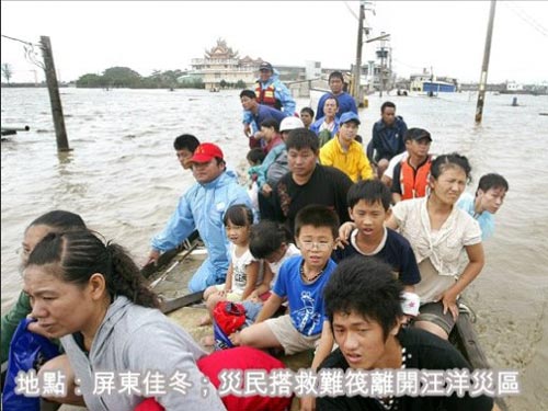 屏东佳冬,灾民搭救难筏离开汪洋灾区。来源:台湾《联合报》