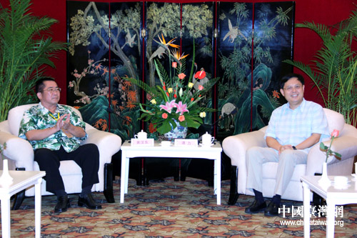 第二届“两岸媒体海南行”10日在海口正式启动,中共海南省委常委、宣传部长谭力(右)在10日晚间会见了由台南县记者协会理事长赖冠璋率领的台南媒体一行(中国台湾网 李徽 摄)