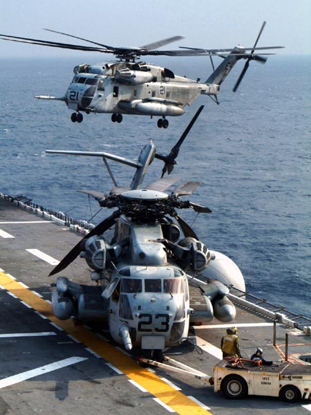 资料图:一架美国海军陆战队远征旅的CH-53E“海上种马”直升机准备降落到两栖攻击舰上。甲板上的那架已经折叠起旋翼,准备拖走。
