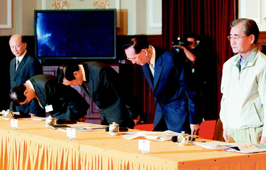 马英九(右三)昨天率台当局“首长”在记者会上道歉。他与萧万长(左二)、“行政院副院长”邱正雄(右二)鞠躬后定住7秒钟,一时不察的“国防部长”陈肇敏(左一)、“交通部长”毛治国(右一)却已先起身。图片来源:台湾《联合报》