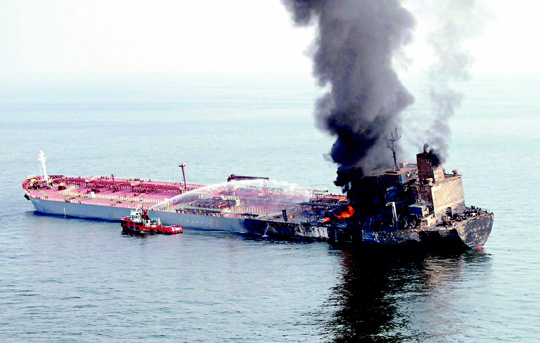 台塑集团旗下油轮“立善轮”18日晚间在马六甲海峡遭英国籍货轮撞击,船上5万8千吨轻油部分外泄并引发大火。马来西亚当局出动救灾人员、直升机抢救,仍有9名大陆籍船员下落不明,含船长在内的2名来自台湾地区的船员则获救。图为消防人员19日持续喷水救灾。图片来源:台湾《联合报》