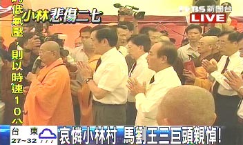 马英九、台当局“行政院长”刘兆玄和台湾“立法院长”王金平等人,22日上午参加高雄县甲仙乡小林村罹难者祈福追思法会。来源:台湾TVBS电视台