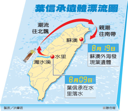 中国台湾网8月23日消息 据台湾《联合报》报道,南投县民叶信承在“88”水灾次日,行经被洪水冲断的台十六线,连人带车坠落浊水溪;10天后,在宜兰县苏澳外海发现他的尸体,从浊水溪入海口漂流了约277.5公里,苏澳海巡队直呼“太不可思议了!”