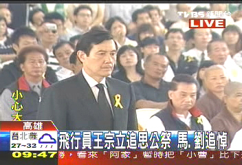 马英九23日出席在“88”水灾救援任务中殉职的台湾“空中勤务总队”飞行员王宗立追思公祭,颁发褒扬令并慰问家属。图片来源:台湾TVBS电视台