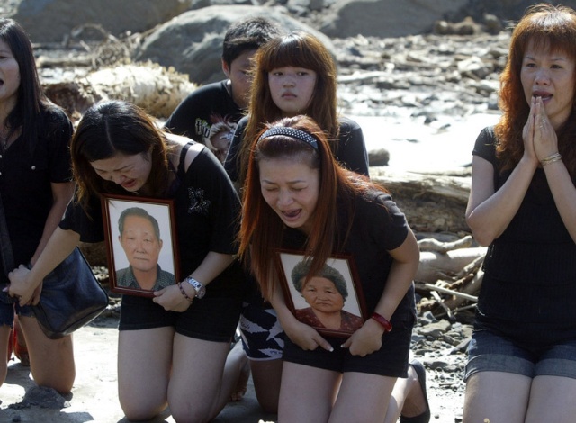 台媒图片:8月15日,小林村罹难者家属带着亲人遗照穿山过河,回到小林村现场招魂。刘家一家40多个亲人遭活埋,到了住家位置,亲人跪地哭泣。