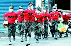 台军中出现44个甲型流感确诊病例,其中4人是在屏东救灾的台军官兵,为免疫情扩大,在灾区清淤、挖尸的救灾台军,昨天统统戴上口罩,保持最佳体力。(来源:台湾《联合报》)