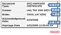 刘德华与朱丽倩(本名朱丽卿)在美国赌城结婚注册的结婚认证曝光,结婚日期是2008年6月23日。来源:台湾《苹果日报》