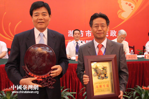 海峡两岸农业融合升级合作恳谈会今天下午在潍坊举行,图为潍台两地互赠纪念品。(中国台湾网 张弛 摄)