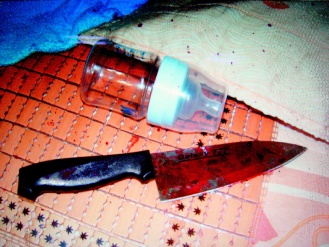 简姓妇人杀死4个月大儿子的凶刀,血迹斑斑,凶刀旁还留有儿子用的奶瓶。图片来源:台湾《联合报》