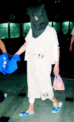 台北县板桥市简姓妇人(戴头罩)狂砍51刀杀害自己4个月大儿子的命案,检方昨天起诉并求处无期徒刑。图片来源:台湾《联合报》
