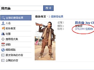 中国台湾网9月3日消息 社交网站Facebook时下在台湾很热门,很多名人在上面都有自己的专属网页,而Facebook上的名人谁人气最高?小天王周杰伦最厉害,粉丝高达37万人;王力宏也有36万名粉丝支持;台湾第一名模林志玲粉丝有10万人;气质美女桂纶镁粉丝也有4万人。