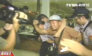 达赖今日结束5天行程返回印度,在其下榻的福华饭店,一大清早就有示威民众激动抗议,还与警方发生拉扯,表达对达赖此行的强烈不满。图片来源:台湾TVBS电视台