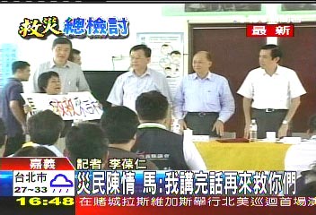 台湾TVBS电视台称,马英九站在第一线和灾民亲自沟通谈迁村问题,面对民众陈情用幽默化解。(罗煜明)