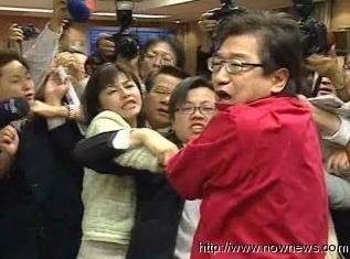 今年4月22日,邱议莹掌掴李庆华后双方发生拉扯。 图片来源:台湾“今日新闻”