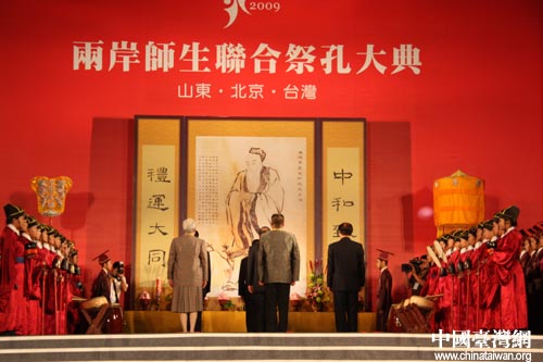 中国台湾网9月27日新竹消息 中华世胄,一脉同源。今天上午,2009年第二届两岸师生联合祭孔大典在台湾新竹县立体育馆举行。两岸三地杰出青年携手,共祭中华先哲孔子,为孔子2560周年诞辰纪念暖寿。