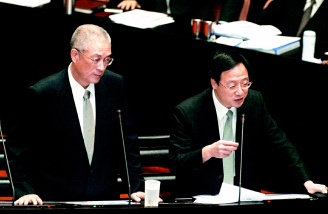 谢长廷系“立委”管碧玲昨天质询台行政当局负责人吴敦义(左),询答过程火药味十足。来源:台湾《联合报》