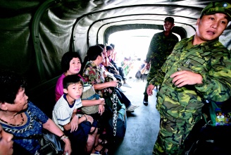 “芭玛”台风威胁下,高雄县六龟乡宝来村民昨天全部撤离,老老少少搭乘军车下山。来源:台湾《联合报》
