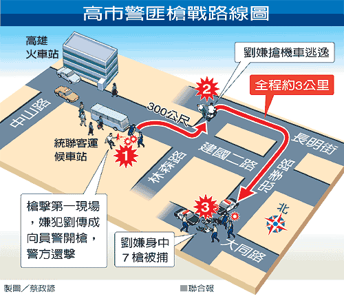 中国台湾网10月8日消息 “就像演电影一样!”高雄火车站前闹市区昨天中午警匪枪战;杀人通缉犯刘传成在客运车站遇警盘查,一言不发即掏枪射击,警员右胸中弹,幸有防弹衣护身未受伤。警员还击,街头互开20多枪。刘传成至少挨了7枪浑身是血,抢了一辆摩托车逃逸,但随即被捕。