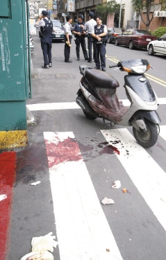 高雄火车站前昨警匪枪战,双方互开20多枪。通缉犯刘传成小腿多处中枪血肉模糊,现场遗留满是血迹的摩托车。 (图片来源:台湾《联合报》)