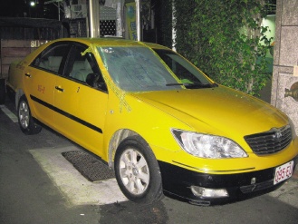 出租车司机林渊晟疑口角引杀机,昨天凌晨在台北市八德路从后方撞死乘客杜赞修,报警后又逃逸无踪。林的出租车在汐止新台五路寻获,前挡风玻璃右侧撞出大洞。(图片来源:台湾《联合报》)