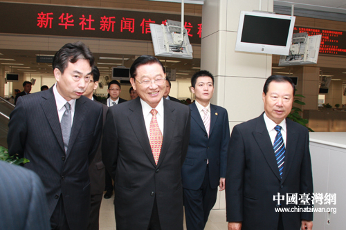 10月29日,新华社副总编辑彭树杰、海协会副会长王在希陪同江丙坤一行参观新华社新闻信息发稿中心。(中国台湾网 田云鹏 摄)