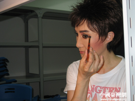 台湾歌仔戏演员在后台精心化妆。(中国台湾网 徐丽麟 摄)