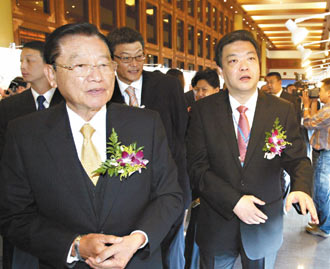 台湾海基会董事长江丙坤(前左)昨天出席第十二届京台科技论坛开幕式。来源:台湾《联合报》