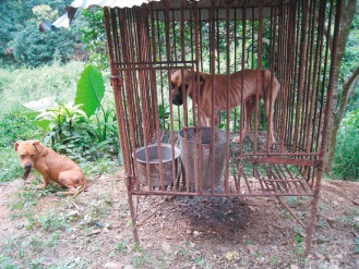 高雄县旗山镇一处私人犬只繁殖场内,两只原本应该雄纠纠的斗犬,饿到皮包骨,看到人靠近还会发生害怕的低鸣。来源:台湾《联合报》