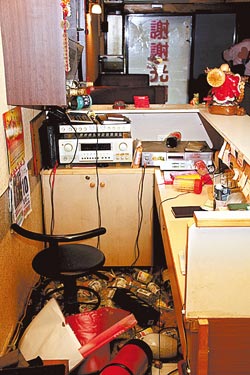 一间卡拉OK遭台北县警察率众砸店,狼藉一片。 来源:台湾《中国时报》