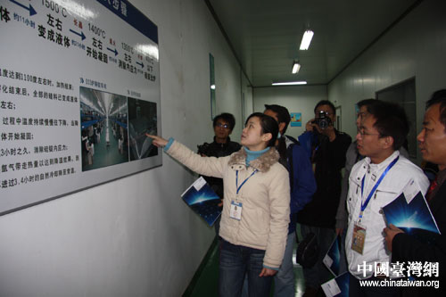 17日下午,第六届中国网络媒体江西行采访团一行在位于新余市的江西赛维LDK太阳能高科技公司参访,图为工作人员向媒体工作者讲解工艺流程。(中国台湾网 高大林 摄)