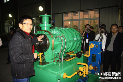 17日下午,第六届中国网络媒体江西行采访团一行在位于新余市的江西华电电力公司参访,图为工作人员向媒体工作者讲解螺杆膨胀动力机。(中国台湾网 高大林 摄)