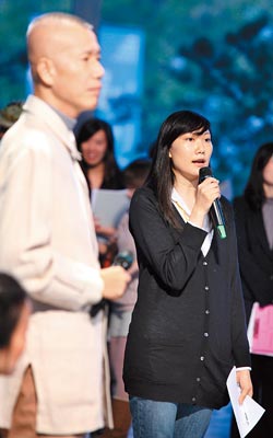 一现身就成为镁光灯焦点,马元中的压力可想而知。她专注地倾听老板蔡国强的致词内容,以流畅的英文快速翻译出来。马英九女儿大秀英文,全场屏息聆听。可能是因为紧张,不难听出马元中的声音有点发抖,时而甩头发的小动作,也透露出要在众媒体前担任现场翻译员,这份差事真不容易。 致词结束后,马元中立刻离开,深怕如果再多待一刻,恐又抢走蔡国强的风采。(陈佳慧)