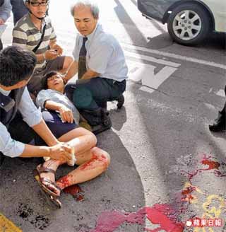 林美志为了护巨款,与抢匪拉扯时遭开枪击中右小腿受伤倒地,血流不止,丈夫李德芳(右)不断在旁安抚。 来源:台湾《苹果日报》