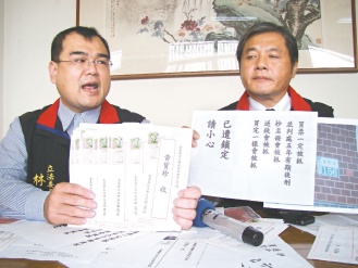 国民党政策会执行长林益世(左)拿出收到的“贿选已遭锁定”信件,指控这是选举奥步。 来源:台湾《联合报》