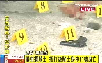 现场的11枚弹壳和歹徒丢下的手枪。 来源:台湾TVBS电视台