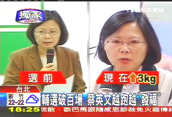 蔡英文本来就不是瘦尖脸形,现在看起来,双颊下巴更成了一道圆弧线,体重增加3公斤,卖力抬轿辅选,怎么会越抬,自己越福态?蔡英文称,“因为行程比较紧凑,吃的地方都不定时,也不知道在哪里,所以每一顿都要吃得很饱。”