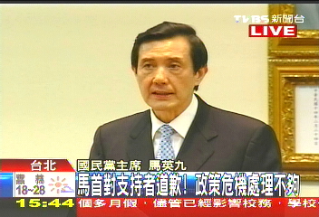 国民党中常会检讨“三合一”选举,党主席马英九两度致歉。来源:台湾TVBS电视台