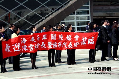 中国台湾网12月21日台中消息 21日中午,海基会工作人员在台中清泉岗机场欢迎由会长陈云林率领的海协会协商代表团一行。当天中午,由会长陈云林率领的海协会协商代表团一行乘坐包机顺利抵达台中清泉岗机场。(中国台湾网 李徽 摄)