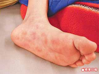 台湾刘姓男童打完疫苗的隔天,脚底就出现红疹。 来源:台湾《苹果日报》