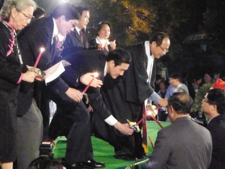 马英九(中)参加“平安暝烛光礼拜”,将祈福烛光传递给民众。来源:台湾《联合报》