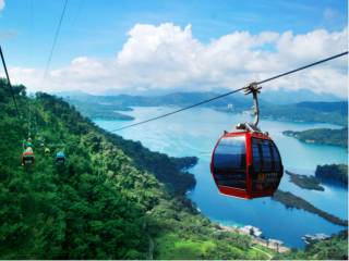 历经18个月施工,日月潭空中缆车完工通车,全长1877米,起点在伊达邵青年活动中心,终点在九族文化村观山楼,与九族缆车连成一气。