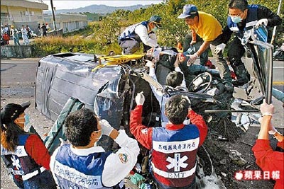 高雄县内门乡昨天发生重大车祸,一辆载有9人的厢型车,疑越过双黄线撞上砂石车,酿成7死2伤惨剧,图为救难人员抢救困在扭曲变形车体内的女司机。来源:台湾《苹果日报》