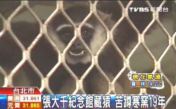 长臂猿见到人群,一会儿躁动不安,一会儿缩在角落,不敌台北的寒流威力频频发抖。这个画面出现的地点不是动物园,居然是台北故宫代管的画家张大千纪念馆。台湾动物社会研究会朱增宏说:“张大千以前虽然有养猿猴,但是对待的方式跟现在完全不一样,它们只能在这么小的空间,长期可以说是备受虐待的。”