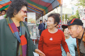 高雄市长陈菊(左一)昨天到左营菜公里参加小区活动,小区老人家热络的上前为她加油。图片来源:台湾《联合报》