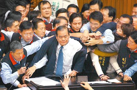 台湾“立法院”昨天召开临时会处理“地方制度规定修正草案”,三读过程中蓝绿“立委”上演全武行,混乱中多名“立委”挂彩。会议主席、“立法院副院长”曾永权在在蓝绿“立委”团团包围、不断推挤冲中,历时近2小时,才三读通过审议。