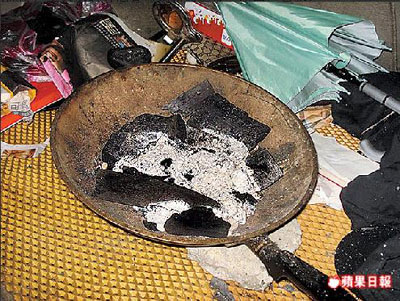 李姓一家四口用来烧炭自杀的炭盆摆在休旅车置物厢。来源:台湾《苹果日报》
